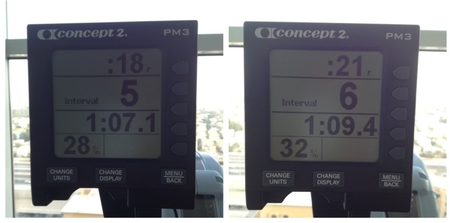 Jeg rodde 300m og hvilte 1 minutt mellom hver intervall. Planen var å gjøre 8 stk, men som sagt ble det mer enn nok med 6 stk ;-)