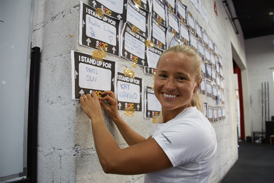 En hel vegg var dekket med plakater der vi kunne skrive opp hvem vi gjorde økten for. Jeg mistet min kjære onkel til kreft i fjor, så det var ham, men også mamma som har mistet broren sin, tante Tordis som har mistet mannen sin, og ikke minst søskenbarna mine Tone og Arve som har mistet faren sin jeg hadde i tankene mens jeg gjorde økten.