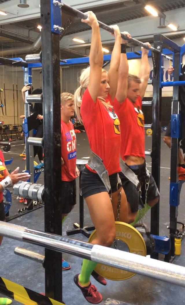Del 1 bestod av en pullup-ladder der vi hadde 2 x 50 sekunder til at alle på laget gjorde én stk pullup/chins med vekt. Første vekt for jentene var 5 kg ekstra, og vekten økte med 2,5 kg til 22,5 kg. Jeg vet faktisk ikke hva guttene startet på, men de endte opp på 44 kg.