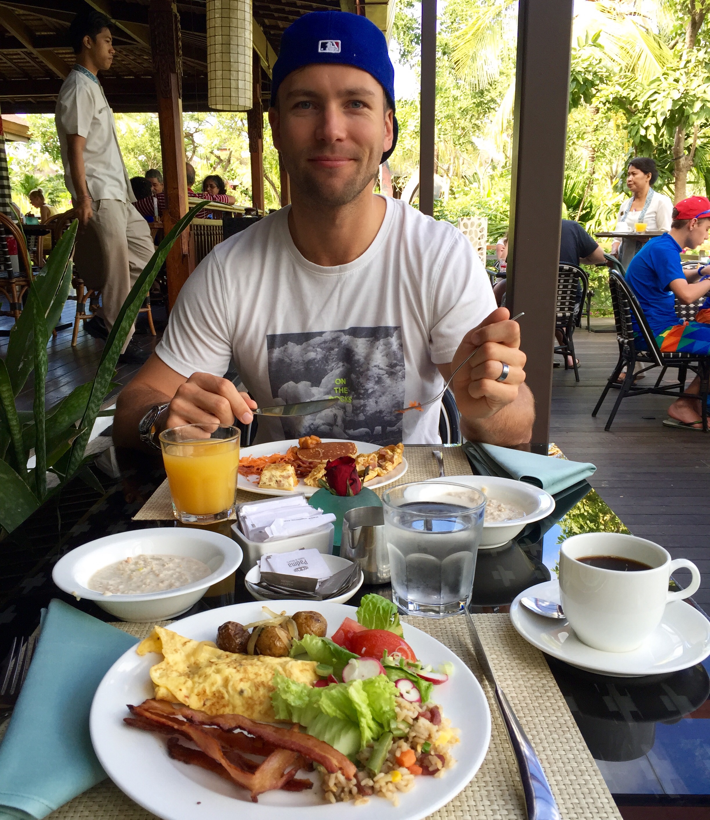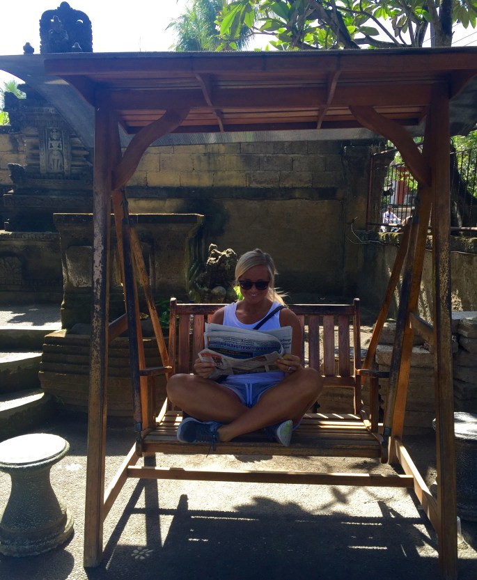 I går hadde vi forresten en kjempekoselig kveld. Vi gikk fra der vi bor til Seminyak, noe som tok litt over én time. Vi gikk langs strandpromenaden, gjennom risåkrer (!) og noe som må ha vært boligområder for lokale. Snakk om sightseeing! Siden vi ikke trente hverken i går eller i forigår var det ok å få rørt litt på seg også.