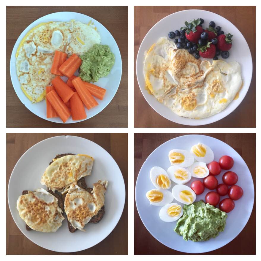 1. Stekte egg med gulrot og guacamole. 2. Stekte egg med bær. Bærene spiste jeg egentlig som dessert, men la de på tallerkenen slik at det skulle se fint ut- som en føkkings ekte blogger hell yeah! 3. Stekte egg på proteinbrød (brød kjøpt i butikk med høyere innhold av proteiner). 4. Kokte egg, cherrytomater og guacamole