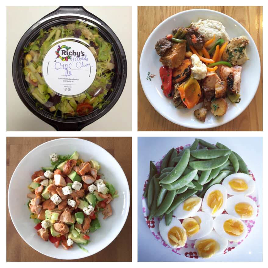 1. Stekt laks med brokkolimos. 2. Salat med stekt kylling. 3. Salat med stekt laks. 4. Havregrynsgrøt kokt på vann og egg.