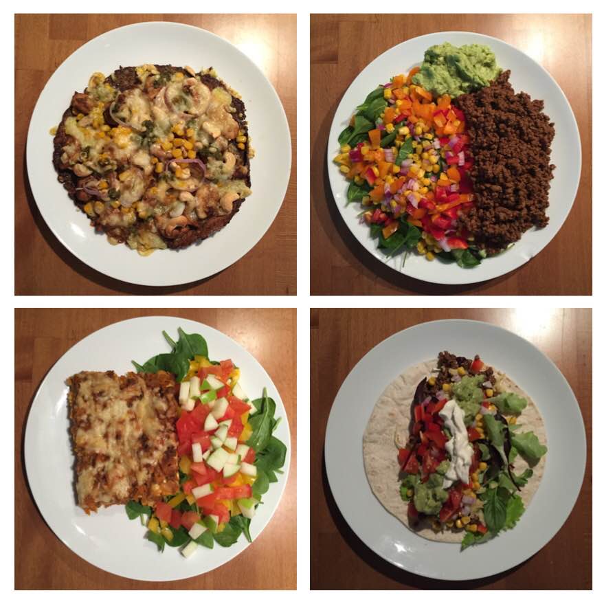 1. Kyllingpizza med proteinlefse som bunn (samme som proteinbrødet, men i lefseform). 2. Tacosalat med guacamole. 3. Hjemmelaget lasagne med grønn salat. 4. Taco