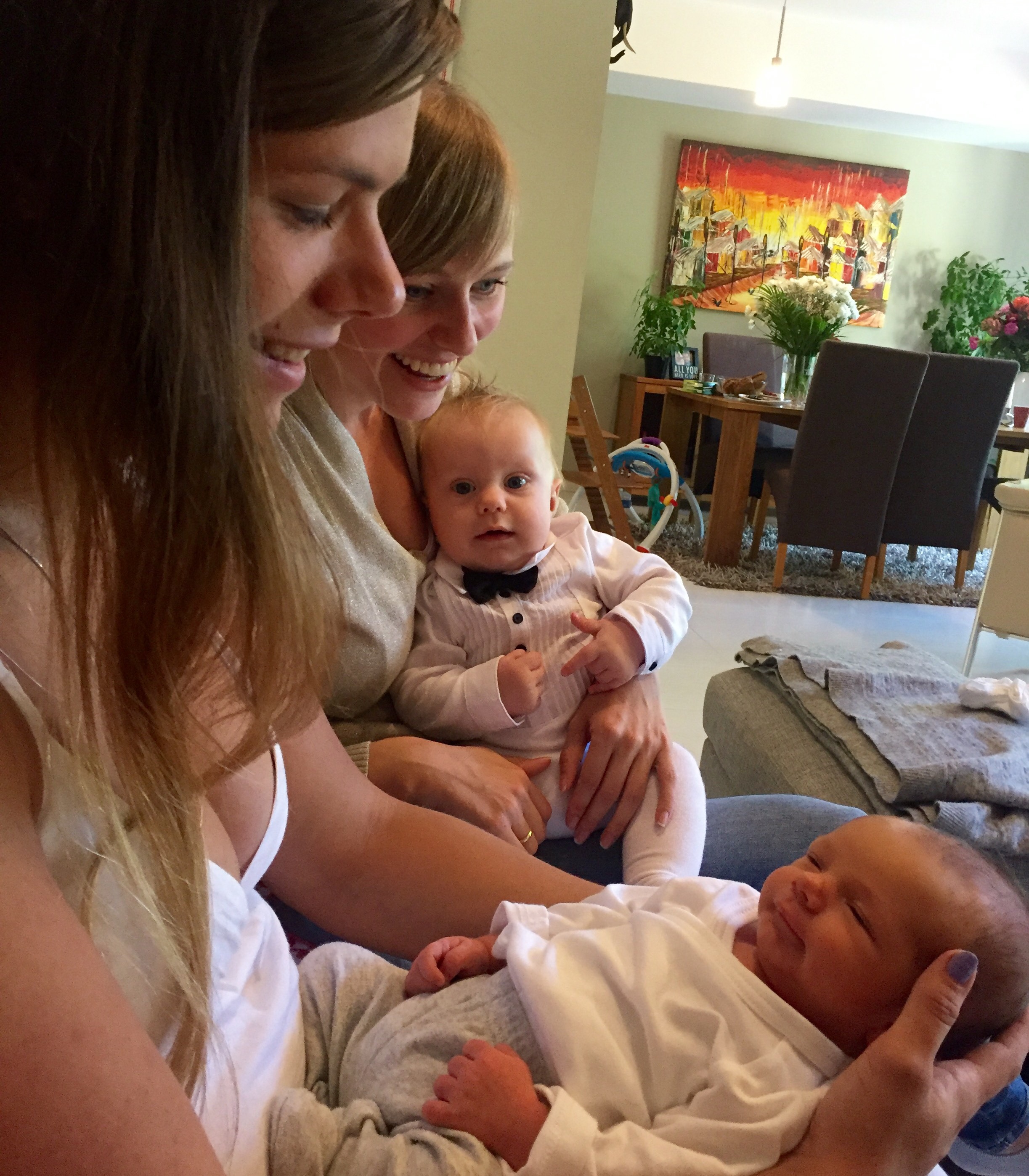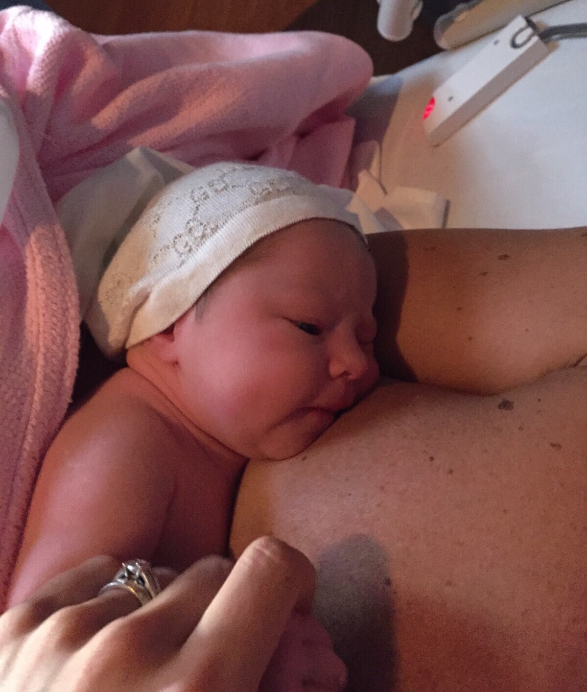 Jeg hadde 3 cm åpning da vi kom inn (jeg tror det var i 11-12 tiden men skal bekrefte med Ian), og de sa til meg at jeg kunne dra hjem dersom jeg ville. På det tidspunktet var riene så sterke og hyppige at jeg ikke kunne tenke tanken å sette meg i bilen igjen, så vi bestemte oss for å bli.