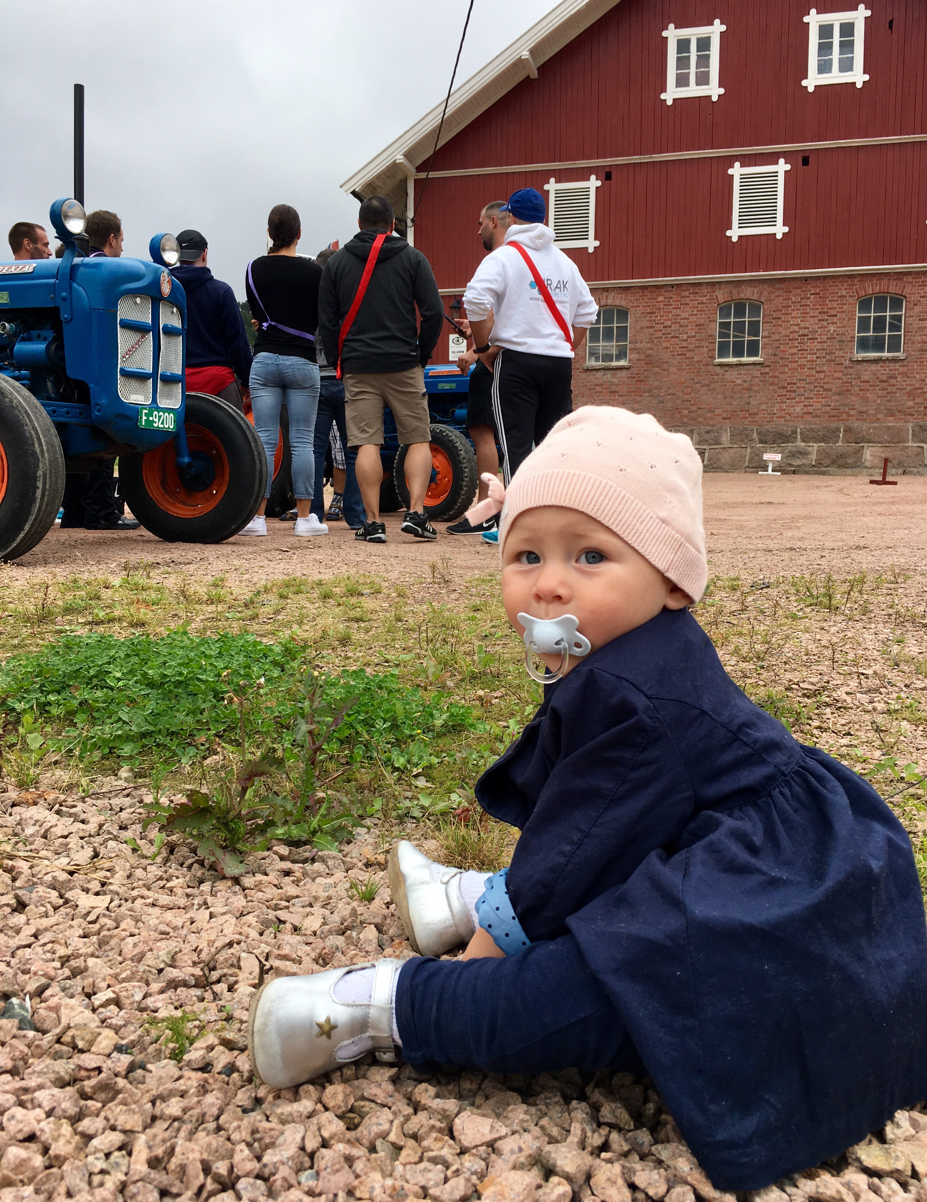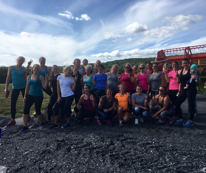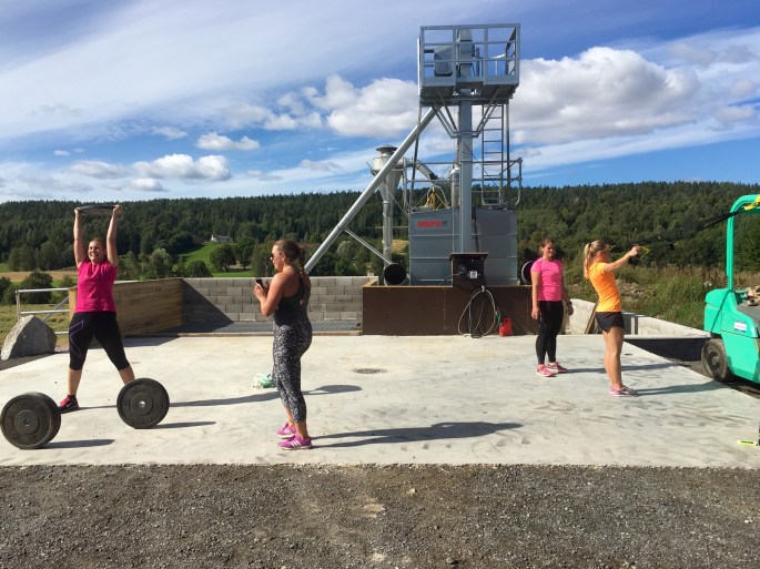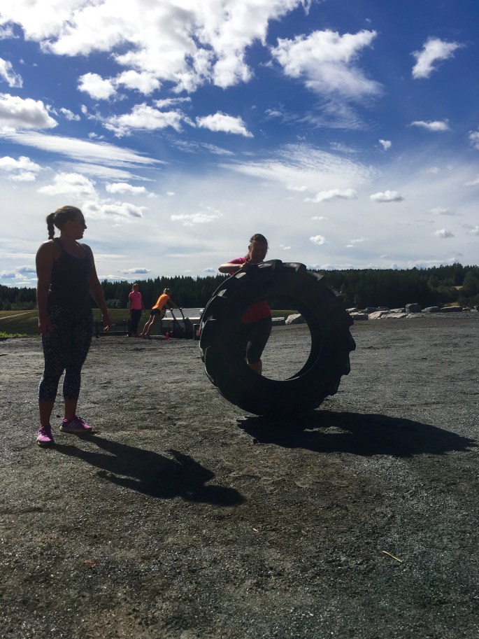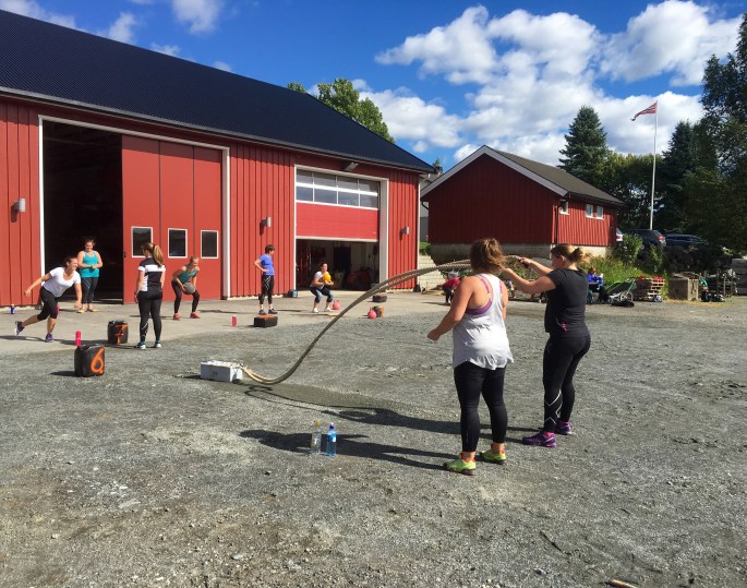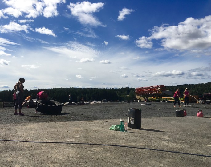 Midt i det hele hadde jeg avtalt med en online kunde som ikke bor langt fra Gardermoen at jeg skulle trene henne og noen venninner. Noen ja! Intet mindre enn 24 jenter (pluss tilskuere!) fikk jeg herse rundt- på en freaking gård! Vi snakker slegge og traktordekk i herlig symfoni med kettlebells og Eleiko-stenger. Herregud så rått! Og snakk om å komme til dekket bord da! Jeg sendte øvelsene vi skulle gjøre til Mari Aurora dagen før, og da jeg kom frem hadde hun gjort klart alle stasjonene med nummer og det hele. Goodiebags til deltakerne hadde hun også fikset med blant annet løk, gulrøtter og rødbeter som var plukket samme morgen. Fy søren så kult!