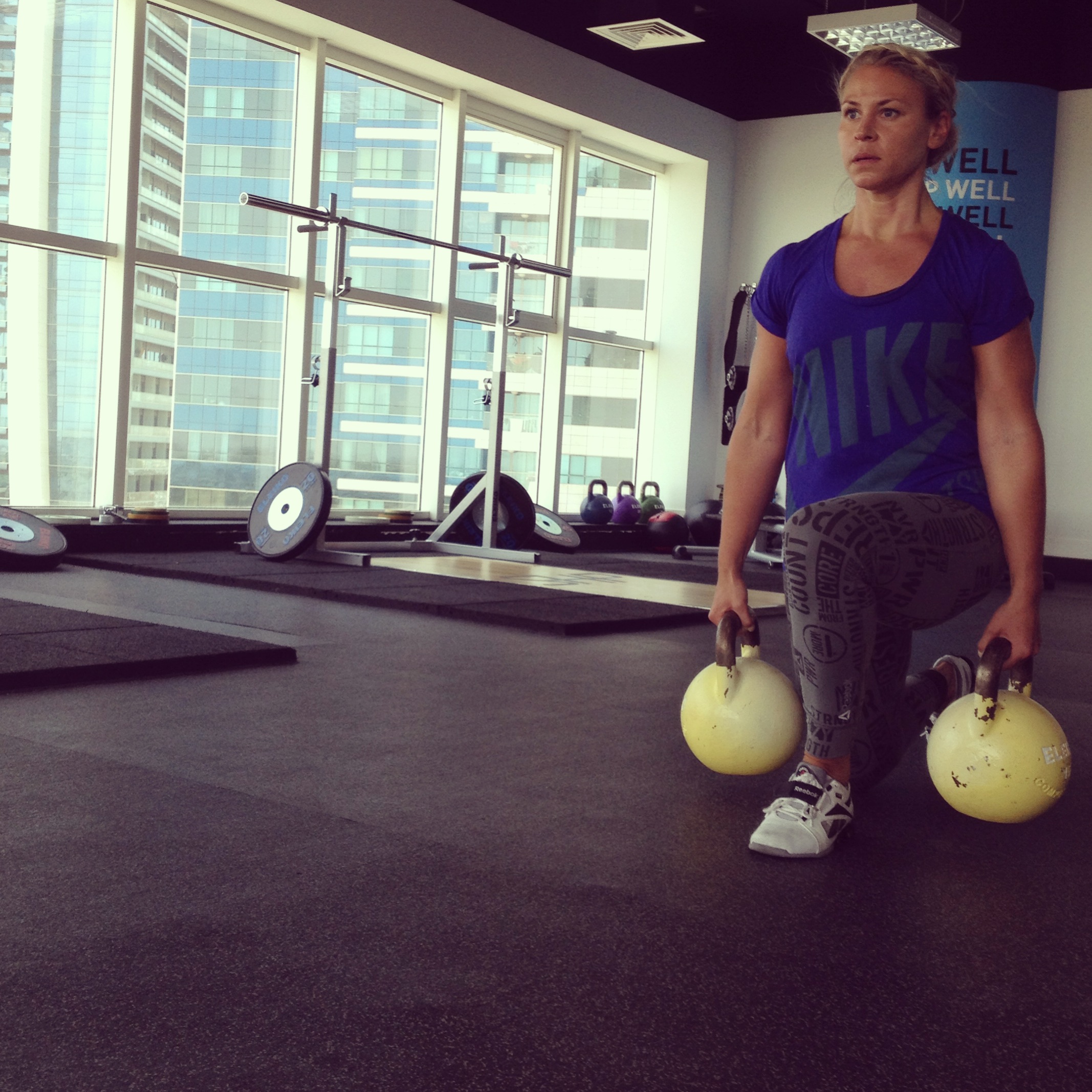 Idag var jeg egentlig åpen for å bare se på mens Merethe trente, og spurte henne halvhjertet hva hun ville trene da hun kom til SHP. «Squat, bulgarske splitt, strake markløft, gående utfall før vi avslutter med en tabata jumping utfall. Og så skal vi gjøre 10 KB swings mellom hvert sett».