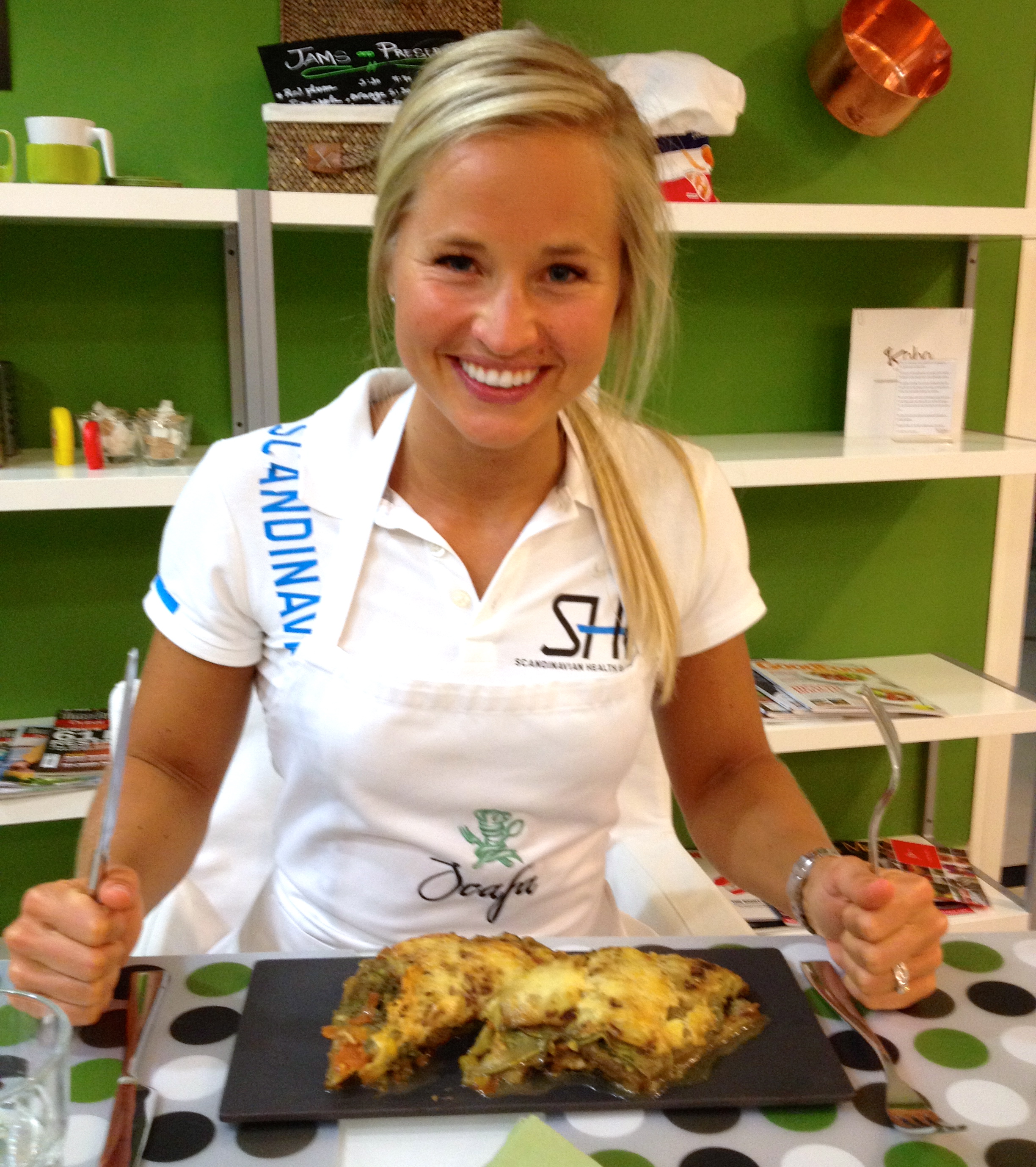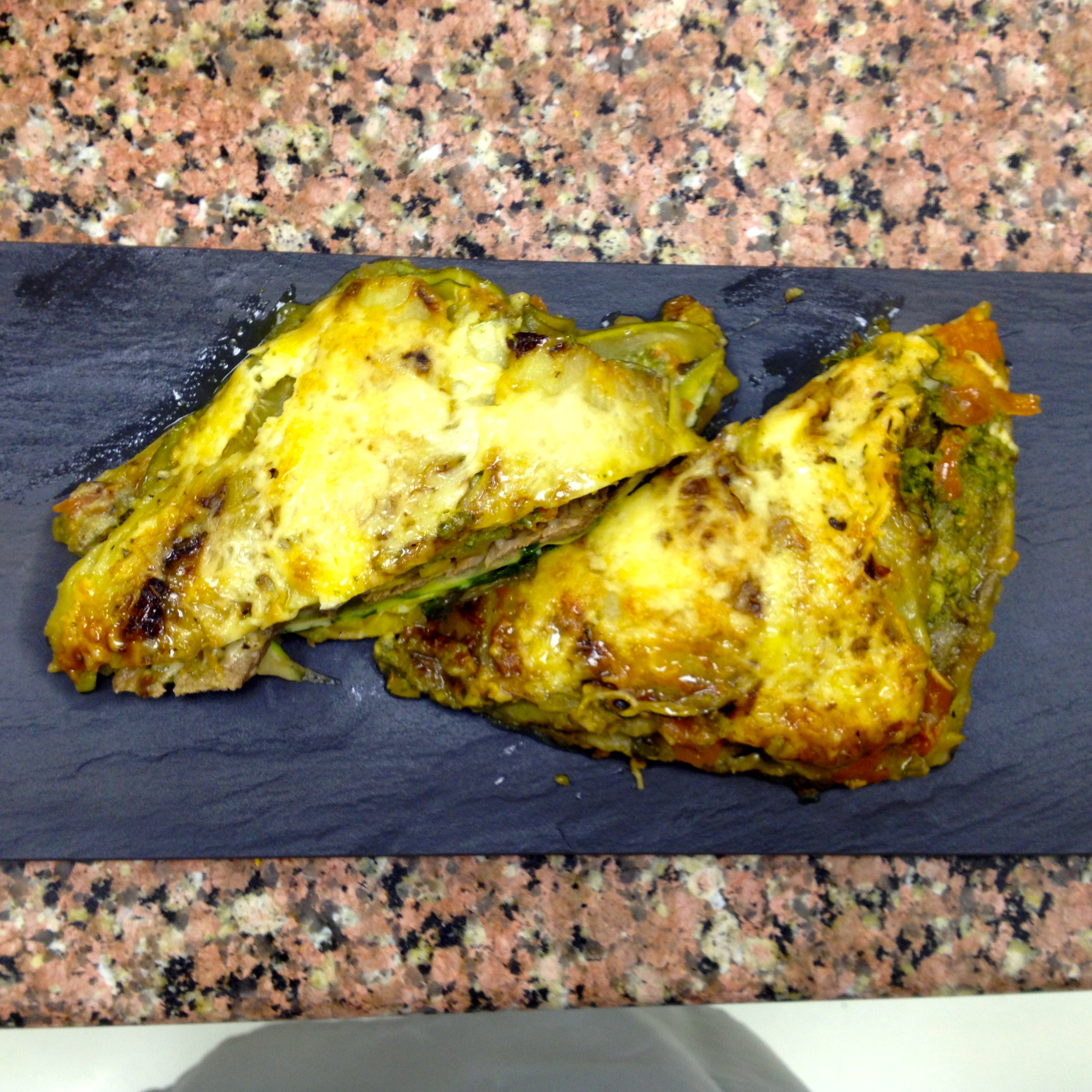 Forretten vi lagde var en pastafri grønnsakslasagne. Istedet for lasagneplater brukte vi aubergine. Det skulle egentlig ikke være kjøtt i denne retten, men det syntes ikke jeg og Melanie noe om så vi spurte om det gikk an å legge til kjøtt. Da gikk kokken og hentet ett kjempefint stykke roastbeef som vi fikk ha i- det kaller jeg bra service!
