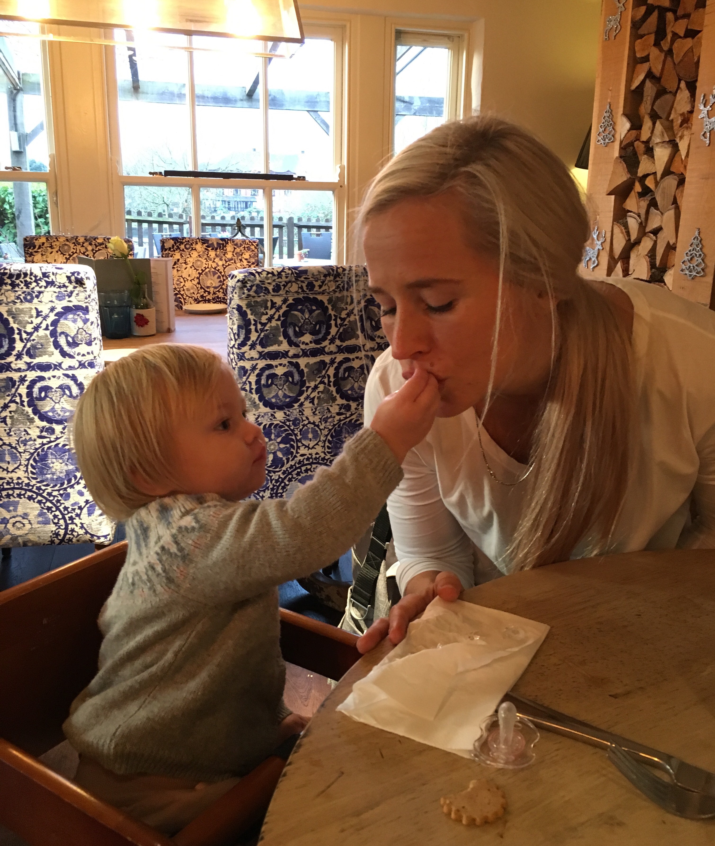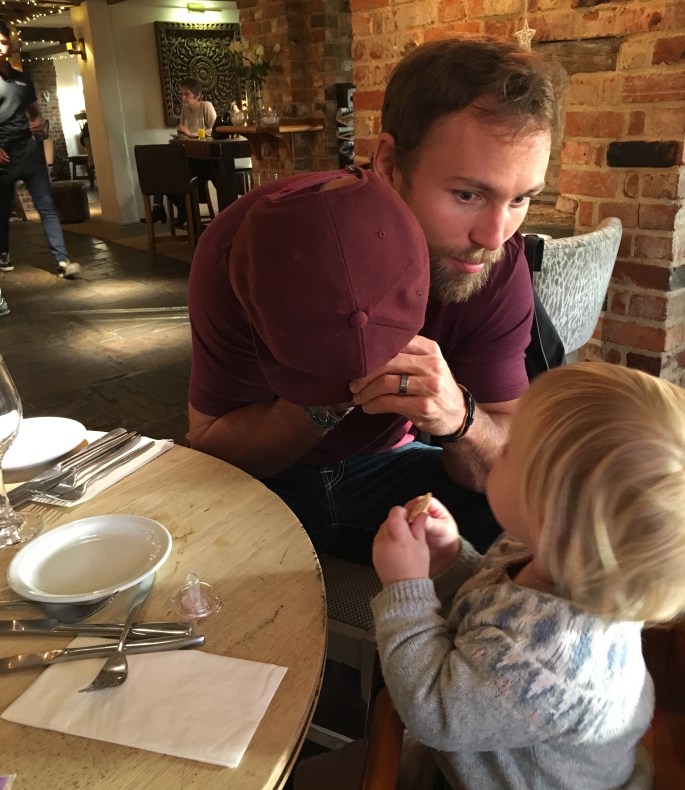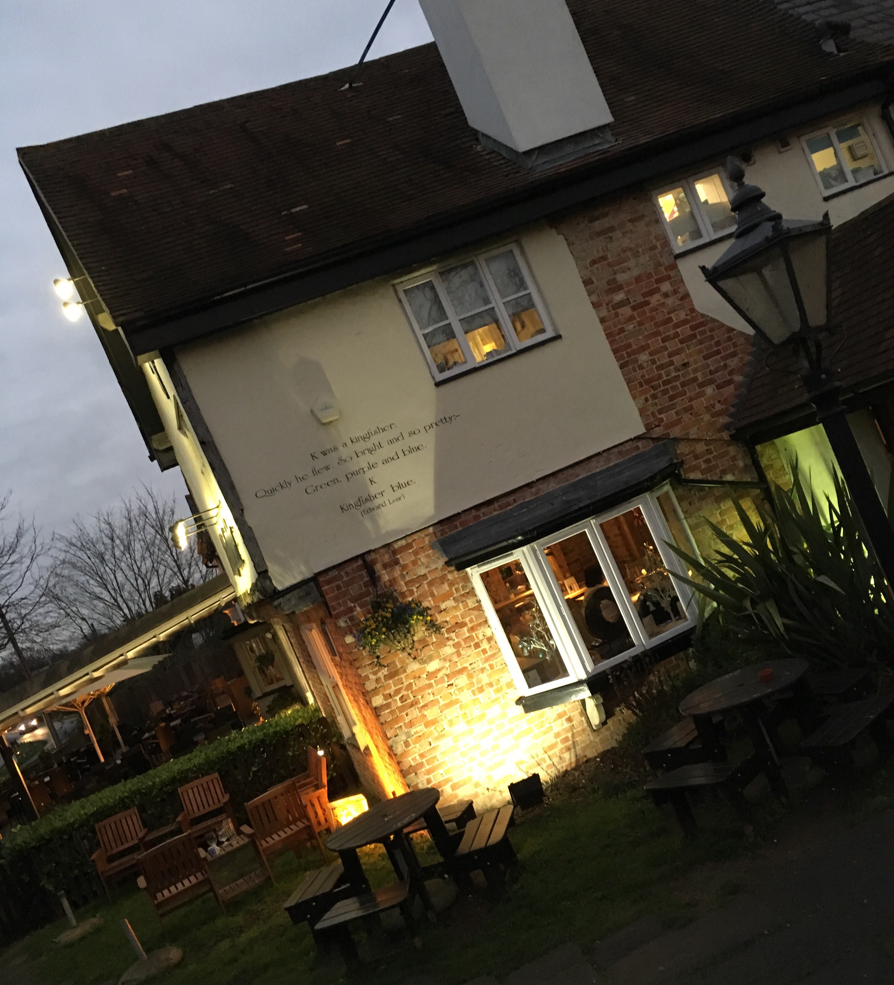 Vi spurte pent om å få forlenget utsjekk, sånn at vi kunne sove litt når Kaia tok sin første hvil, og det fikk vi. Herlig! Nesten to timer i senga og en dusj senere var vi klare for å utforske området. Det var fullt på alle hotellene på selve flyplassen, så vi har sovet ett stykke fra Heathrow. Like ved hotellet lå en kjempekoselig restaurant og vi ble plutselig veldig sultne begge to ;-) Jeg fikk hamburger, pomfri og kaffe, mens Ian fikk kalkun og cider (!). Og så gled det jammen ned litt ostekake også- det er jo tross alt nyttår! Lol.