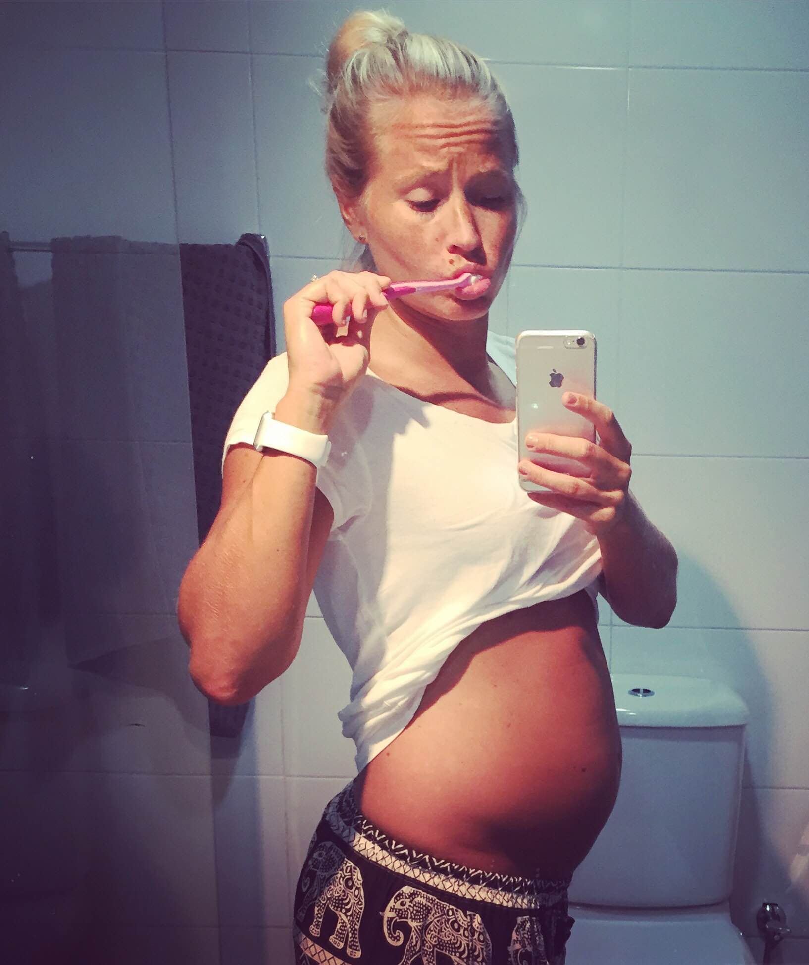Jeg forstår om noen synes at det er forferdelig narsessistisk, selvopptatt og ikke minst usunt å ta slike bilder av seg selv, men so be it. Jeg gjør det, og føler meg ikke skadet i hodet av den grunn. Jeg tør til og med påstå at jeg ikke er alene om å gjøre det. Det er gøy å ha slike bilder å se tilbake på, men da jeg bladde gjennom bildene på flyet gjorde det meg litt trist. Jeg ble ikke trist fordi jeg nå ikke ser ut på samme måte; det finnes ikke antydninger til magemuskler på magen min lenger, armer og skuldre har fått ett godt lag fett, og på rumpe og lår ligner huden mer en appelsin enn fersken liksom. Mer fylde i kinnene har jeg også fått gitt, og der manglet det absolutt ingenting fra før. Men det er greit. Det er en del av å være gravid.