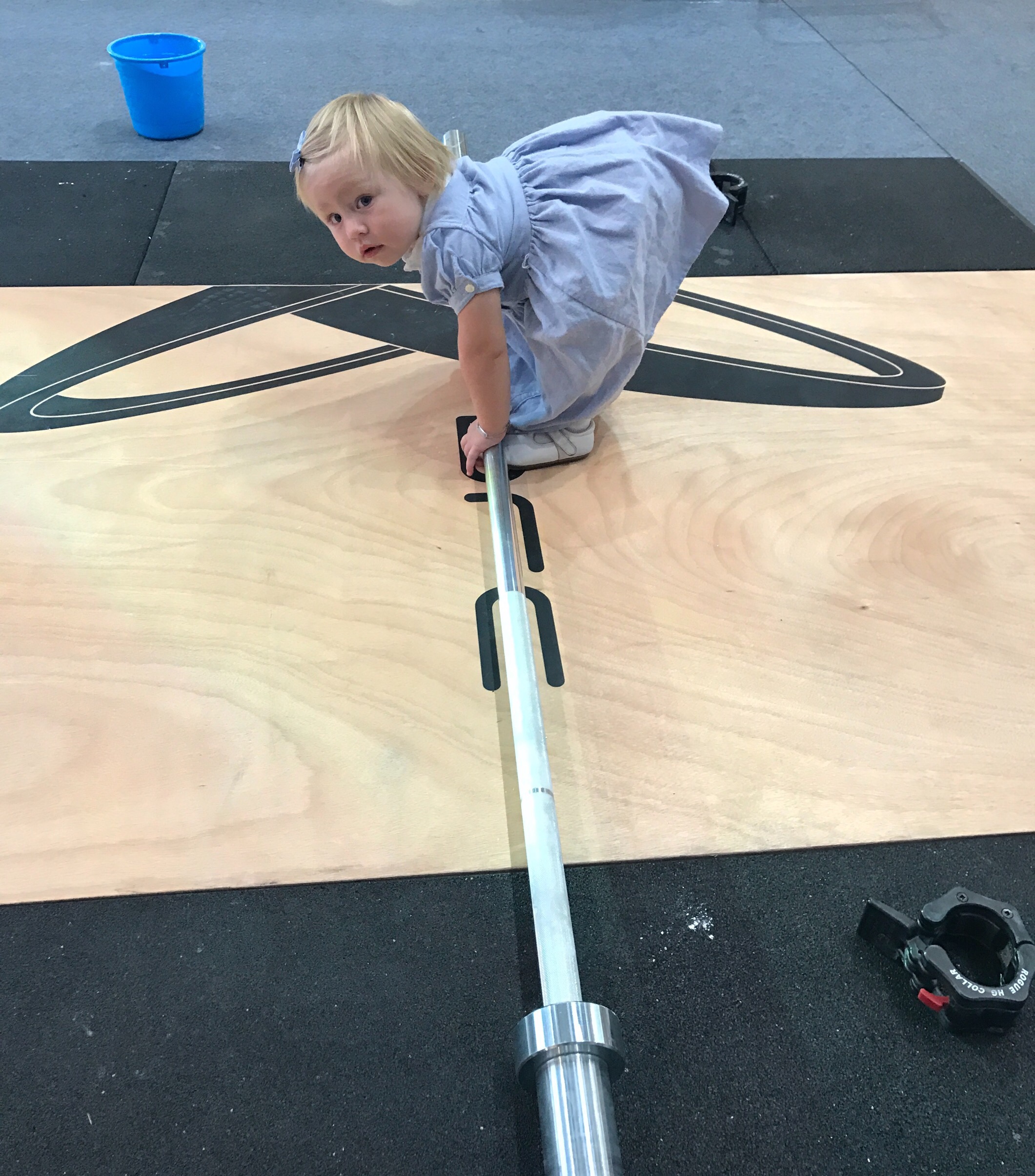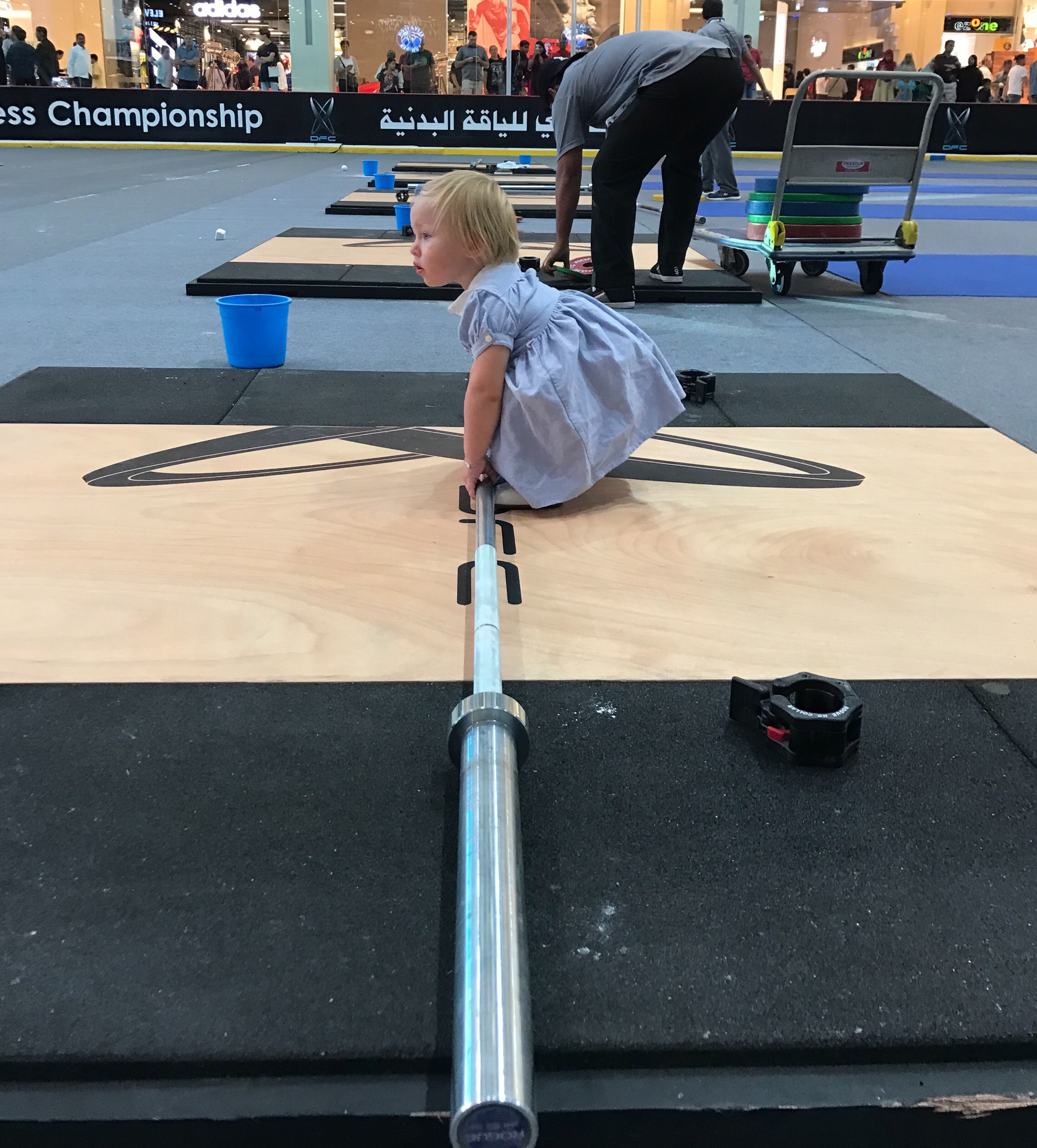 Vi ble værende i 7 (!) timer, og jeg kan ikke huske sist jeg var så lenge på ett kjøpesenter. Kaia klarte seg overraskende bra, og var i storform. I mellom øktene snek hun seg til og med ut på arenaen hvor vektene lå, og prøvde å løfte stengene og lekte med kalkbøttene. Den skal tidlig krøkes si!