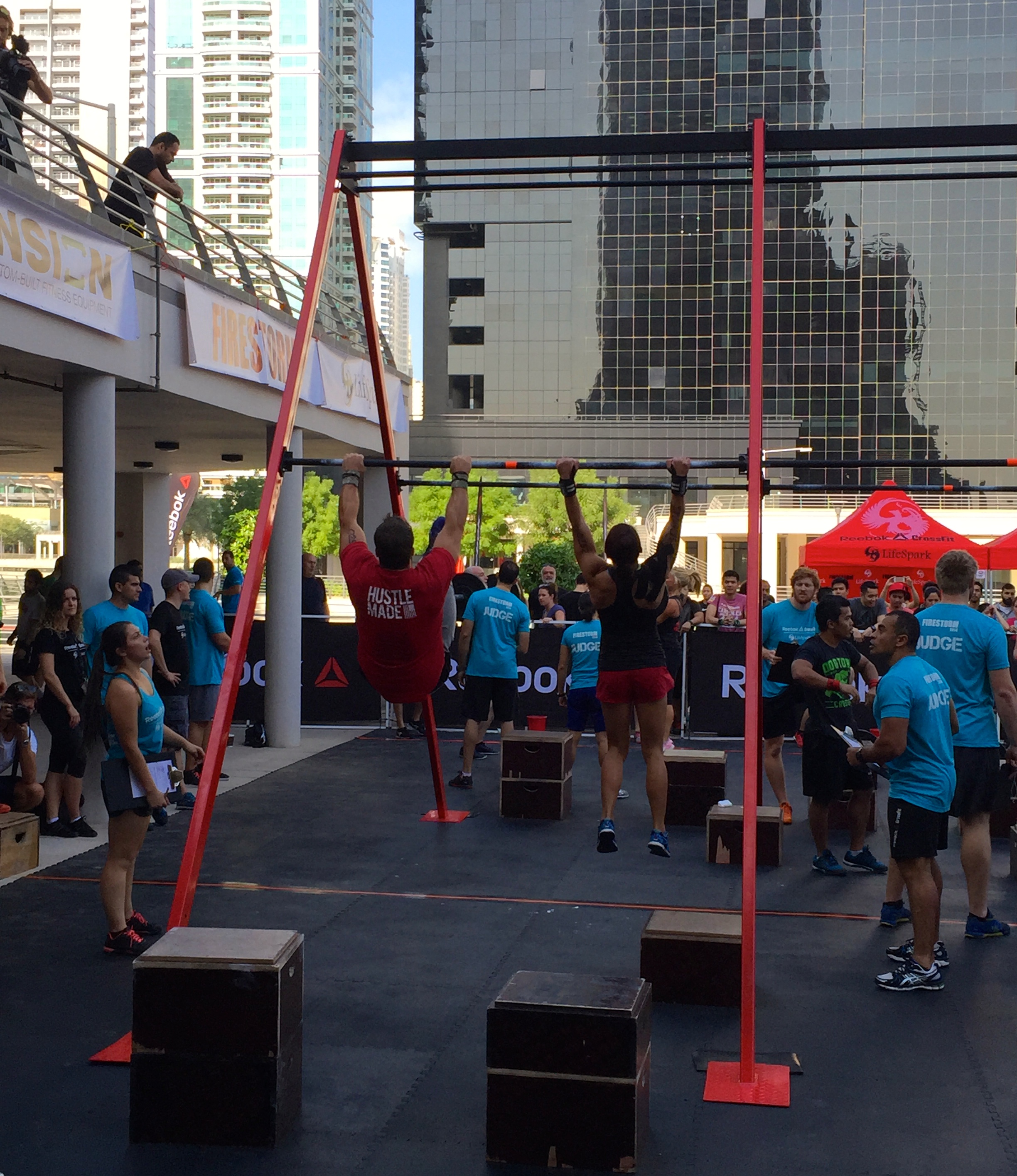 Første økt var en 12 min amrap med 3 push press (jentevekten var 43kg, jeg vet ikke guttevekten), 6 toes to bar, og 9 box-jump-overs. Vi jobbet i par, én gutt og én jente om gangen, og fikk ikke gå videre til neste stasjon før begge hadde fullført alle reps. Det andre paret på laget hvilte imens, men jeg skal love det ikke var mye hviling på vårt lag! Dette var desidert dagens mest slitsomme økt, og jeg var livredd for å sinke de flinke lagmedlemmene mine! Men vi klarte oss bra, og vant med 783 repetisjoner totalt- hele 82 repetisjoner foran det neste laget ;-)