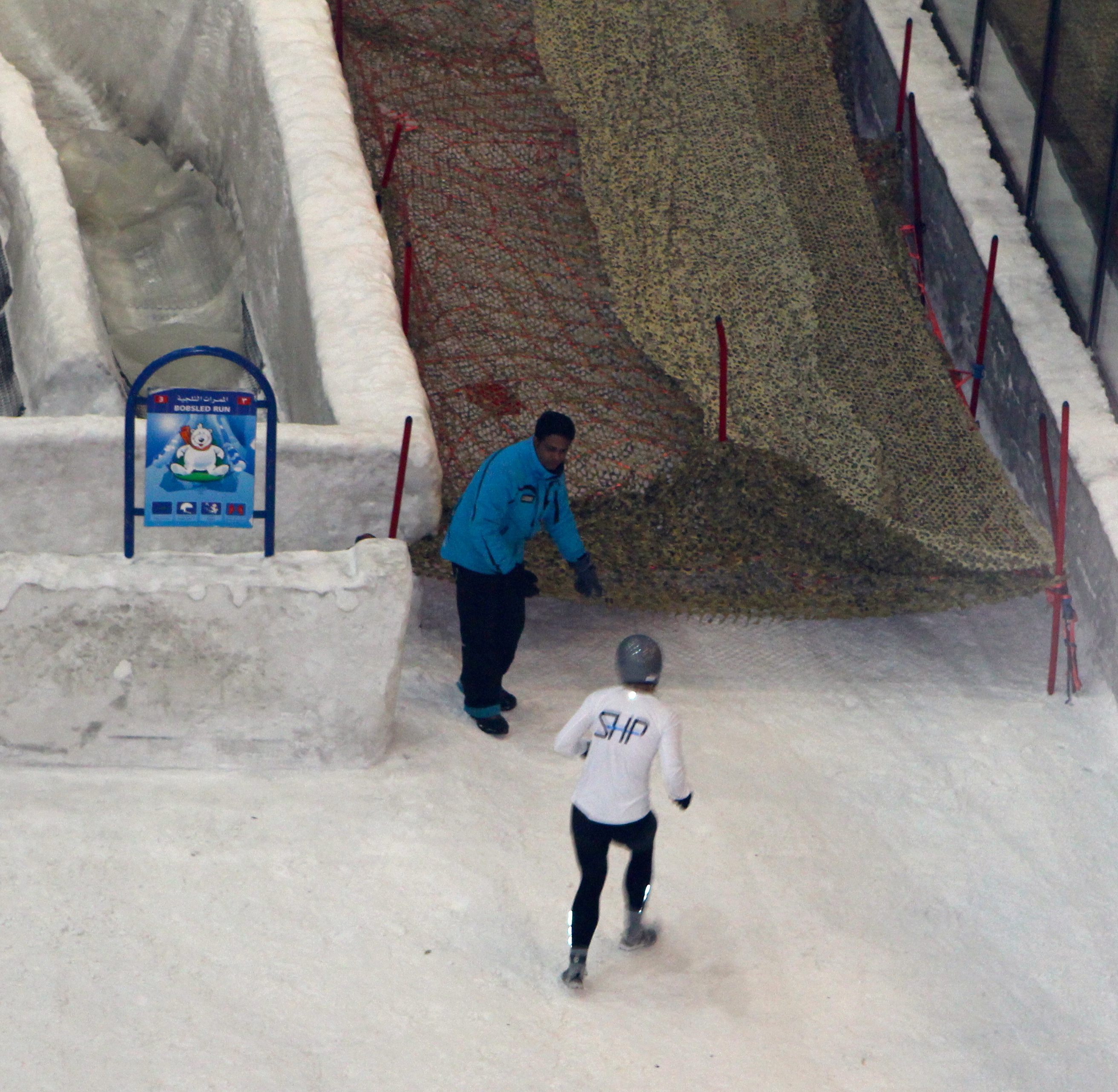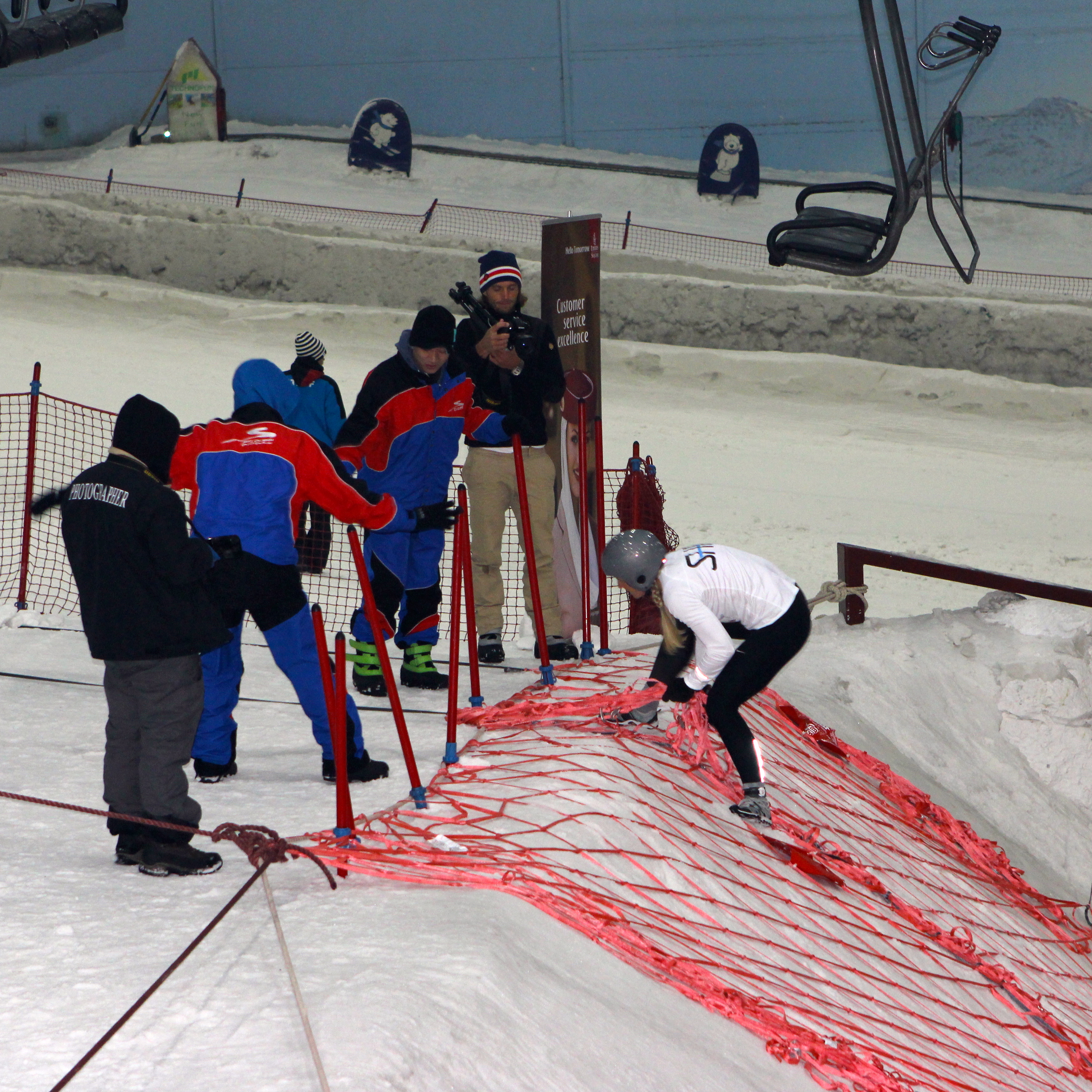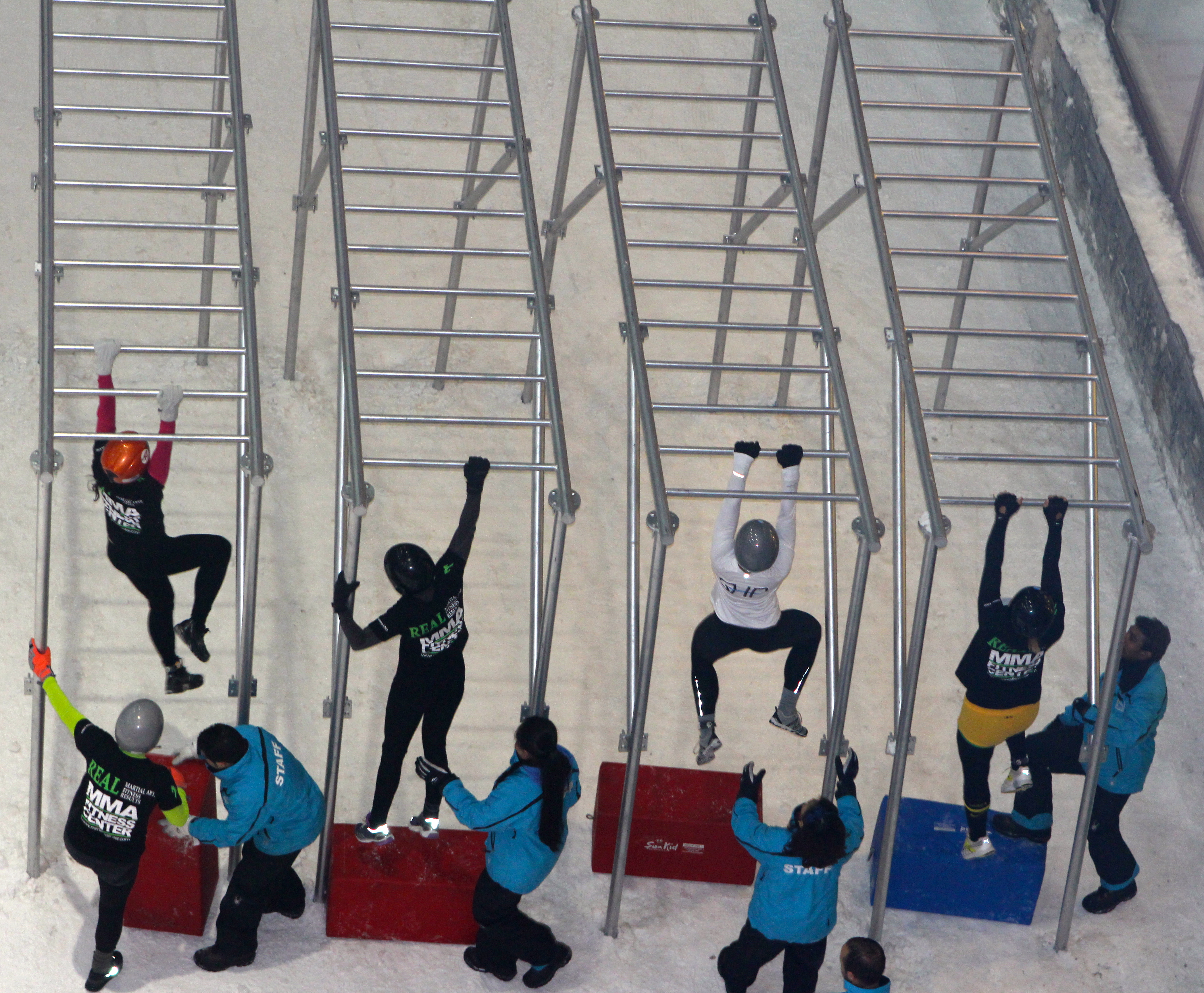 Da startsignalet gikk var det bare å løpe inn i selve Ski Dubai uten noe form for briefing om hva som var i vente. Det første som slo meg var selvsagt hvor kaldt det var- det er jo nesten 10 måneder siden jeg kjente en slik kulde på kroppen! Første greie, monkeybarsene, gikk ok, men deretter ble jeg litt forvirret om hvor jeg skulle løpe videre. Etterhvert forstod jeg at det iallefall hjalp å se etter blåkledde folk, og etter det gikk det noelunde greit. Det var under nett, gjennom tau, klatring over vegget og murer av snø, balansering, snøspading, dekkflipping og vi måtte til og med gjennom ett freakings isbad!