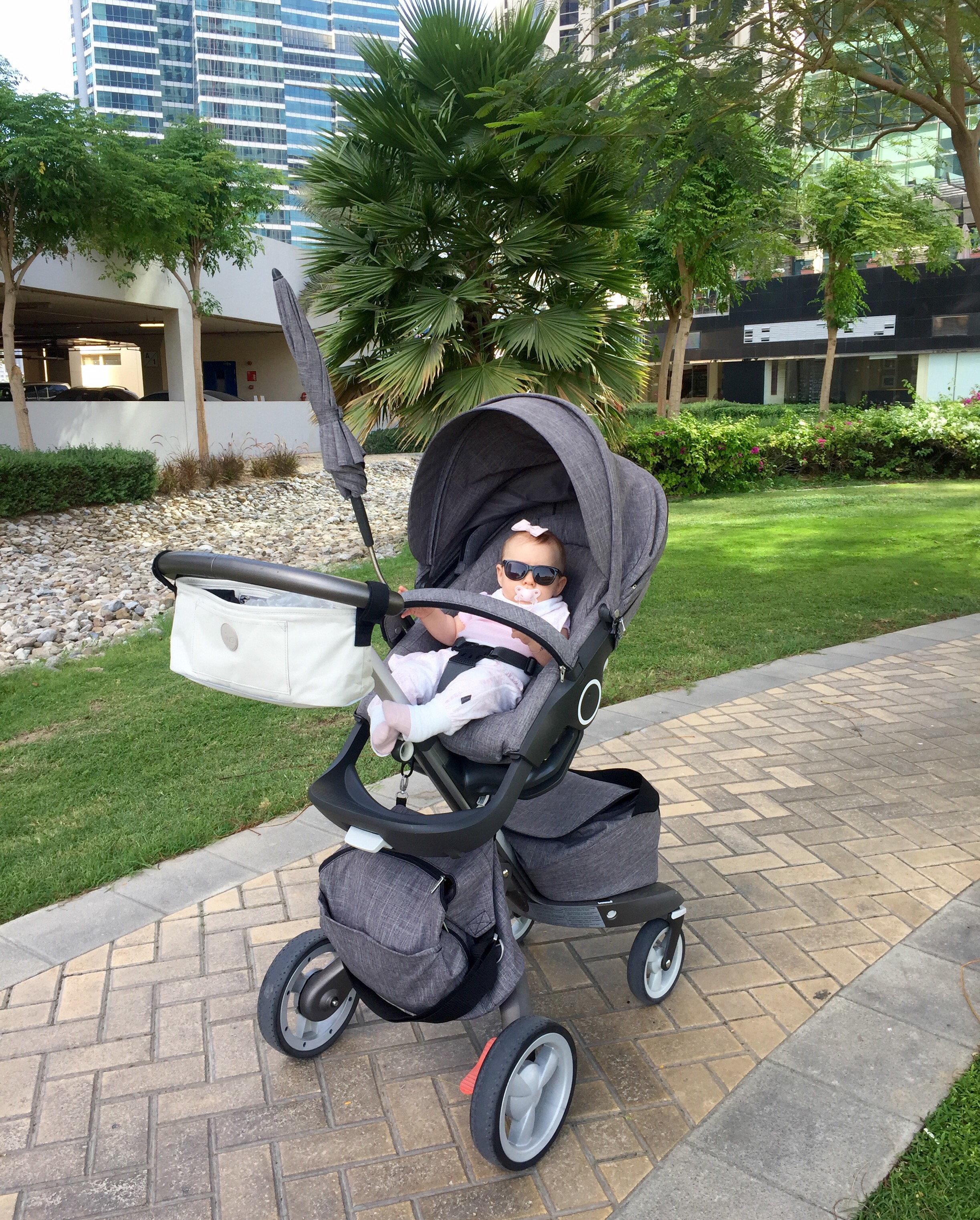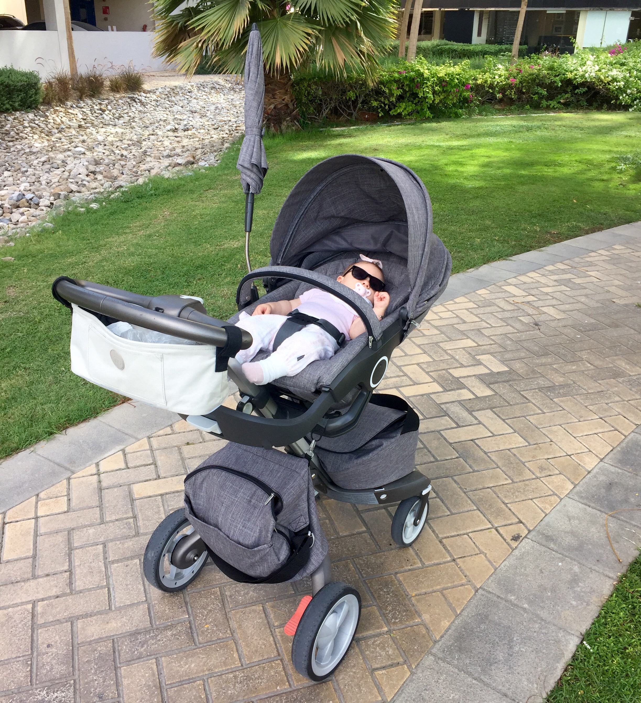 At jeg nå ikke har ett lett tilgjengelig sted for det essensielle løste jeg ved å kjøpe den lille grå (eller er den beige?) baggen som henger på styret. Den skulle jo vise seg å være mye mer genial enn lommene i carrycoten, så for alle dere med Stokkevogn- I highly recommend it! Det er mulig det finnes versjoner som matcher bedre altså, og for alt jeg vet har kanskje Stokke en egen versjon. Om ikke så burde de seriøst vurdere å lage en :-D