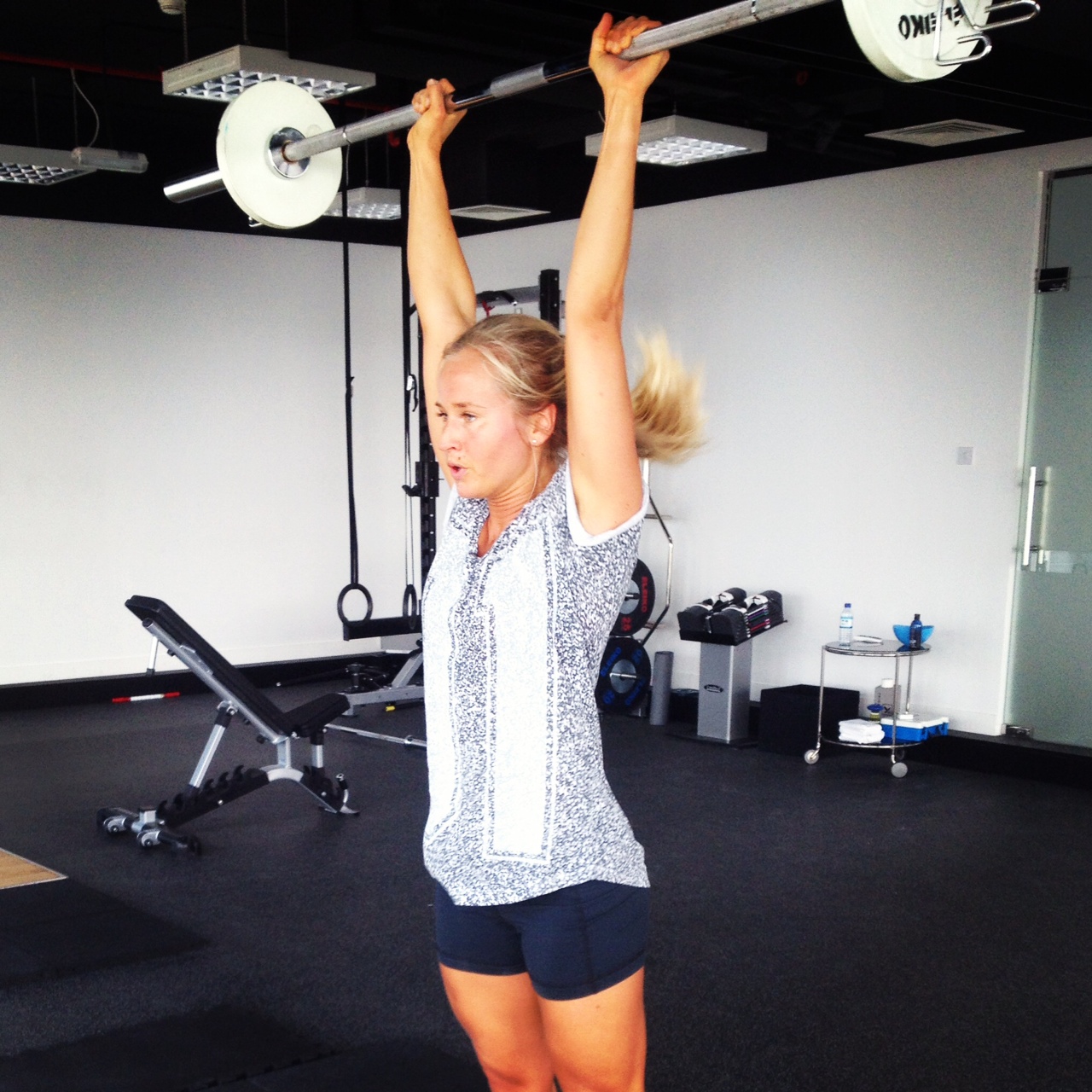 pullups kan som dere sikkert vet være ganske røft for hendene. Slik så mine hender ut allerede FØR jeg hadde startet! Veldig vakkert, og veeeeeeldig feminint..en thruster består av en..knebøy, etterfulgt av en..push press!